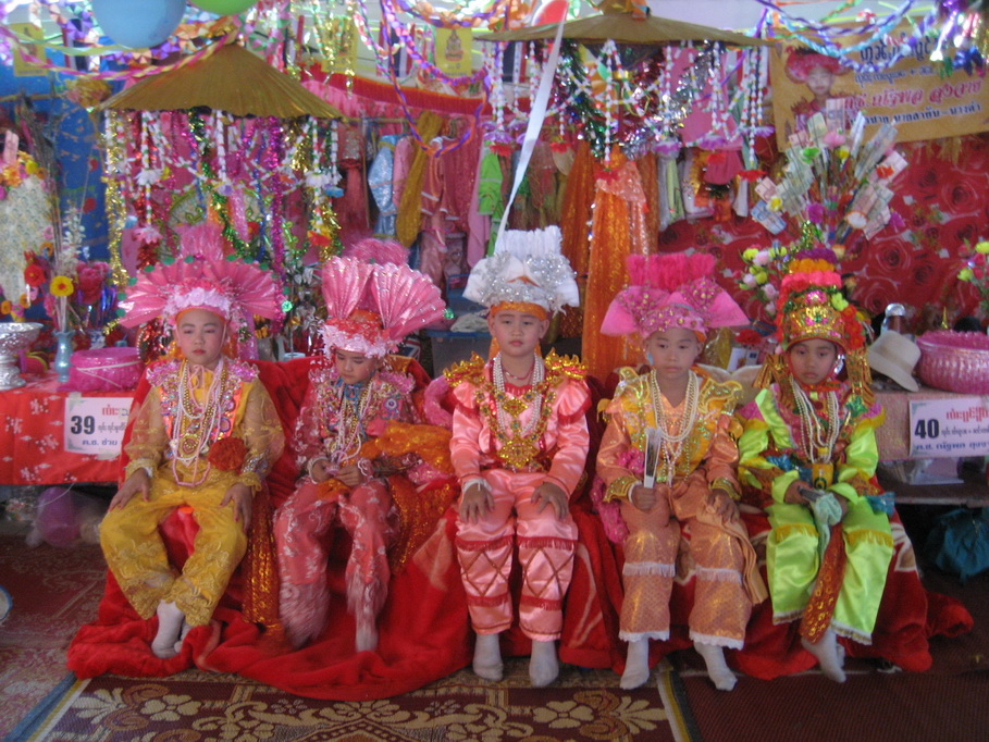 It consists of taking novice monastic vows and participating in monastery life for a period of time that can vary from a week to many months or more. The ceremony goes on for three days, as the boys (dressed up like princes in imitation of the Lord Buddha, who was himself a prince before setting out on the religious path) spend the entire time being carried around on the shoulders of their older male relatives. On the third day they are ordained and enter the monastery for a period of at least one week, and sometimes many years. The boys are beautifully made up with rouge and lipstick and dressed in fine silks making the festival very colourful.