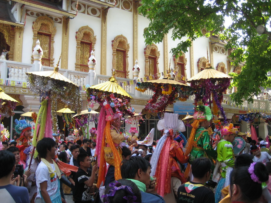 The end of March and the beginning of April is the time of the 3-day festival of Poy Sang Long when, in the city of Chiangmai, pre-teen boys are inducted into the Buddhist novice hood. The first day of the 3-day festival, the young participants are the focus of family feasting and gift giving before the boys are escorted to the temple to have their eyebrows and heads shaved and be ritually cleansed and anointed by bathing in sacred water. The parade to the temple is accompanied by the shrill of flutes, the beat of drums and the clash of cymbals as local musicians give their support and respect to the boys.